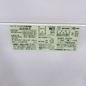 拝見した商品はSHARP製ノンフロン冷凍冷蔵庫 SJ-D15K-Hで、2024年製の比較的新しいモデルです。冷蔵室94L、冷凍室58Lの構成で、一人暮らしや二人暮らし向けとして人気のある容量帯です。