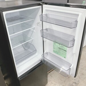 外観には使用に伴う細かな擦れや軽微な小傷が見受けられましたが、目立つへこみや大きな破損はありませんでした。庫内は比較的きれいな状態で、ガラス棚・ドアポケット・野菜ケースなどの付属パーツも揃っていました。冷凍室の引き出しや製氷トレーも残っており、動作確認でも冷却機能に問題はありませんでした。