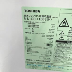 拝見した商品はTOSHIBA(東芝)ノンフロン冷凍冷蔵庫 GR-T15BS(K)で、定格内容積153Lの2ドアタイプです。冷蔵室110L・冷凍室43Lの構成で、コンパクトながら収納力があり一人暮らし世帯で人気のモデルです。