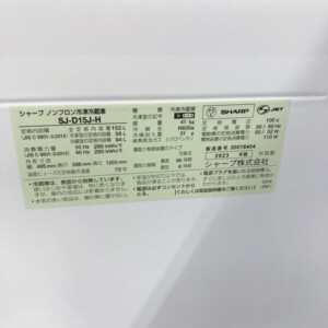 お預かりした商品はSHARP(シャープ)ノンフロン冷凍冷蔵庫 SJ-D15J-Hで、2023年製の比較的新しいモデルです。定格内容積は152L(冷蔵室94L・冷凍室58L)で、単身世帯や二人暮らしのサブ冷蔵庫としても人気の高いサイズ帯です。