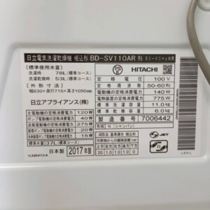 お引き取りした商品は日立のドラム式洗濯乾燥機 BD-SV110ARで、洗濯容量11kg・乾燥容量6kgの大容量モデルです。日立の人気シリーズ「ビッグドラム」のスリムタイプで、家庭用ドラム式洗濯機の中でも需要の高い機種となります。