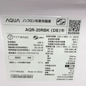 拝見した商品はAQUA製の2ドア冷凍冷蔵庫 AQR-20RBK(DS)で、2025年製・容量201Lの家庭向けモデルです。冷蔵室133L、冷凍室68Lのバランスの良い容量設計で、単身世帯から少人数世帯まで幅広く使用される人気サイズの冷蔵庫になります。