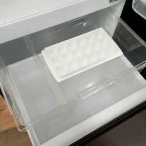 庫内の棚板やドアポケットもすべて揃っており、冷蔵室・冷凍室ともに清潔に使用されている印象でした。冷凍室には付属の製氷トレーもあり、パーツ欠品がない点も査定評価につながりました。通電確認を行ったところ冷却動作も問題なく、正常に稼働している状態でした。