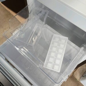 一方で庫内は比較的きれいに使用されており、棚板・ドアポケット・野菜ケース・製氷トレーなどの付属パーツも揃っている状態でした。冷蔵・冷凍ともに動作確認を行い、冷却機能も問題なく正常に稼働していることを確認しています。