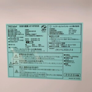 今回は東村山市にお住まいの40代男性・会社員・単身・賃貸(アパート)のお客様より、TAGlabel 冷凍冷蔵庫 AT-RF85B(2020年製)を出張買取にてご依頼いただきました。