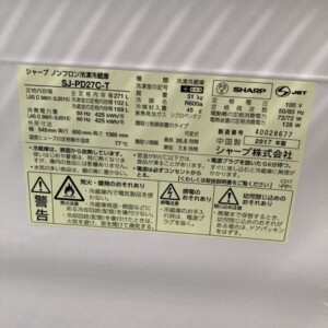 東京都あきる野市へ出張買取 シャープ SJ-PD27C-T 冷蔵庫 2017年製 使用感ありのため適正価格で査定しました