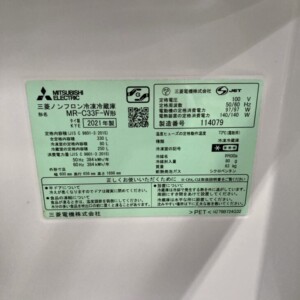 東京都福生市へ出張買取 三菱電機 MR-C33F-W 冷蔵庫 2021年製 やや使用感ありのため適正価格で査定しました