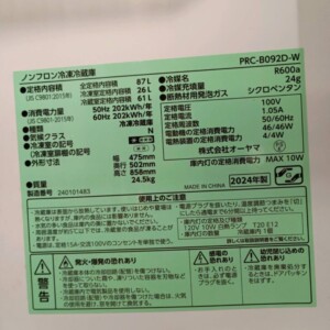 今回のPRC-B092D-Wは、2024年製と比較的新しい年式であることに加え、全体的に使用感が少なく美品であった点を高く評価しました。さらに87Lクラスの冷蔵庫は単身者向け需要が高く、再販しやすい点も査定に反映しています。中古市場の価格帯と再販コストを踏まえた結果、7,500円での査定価格をご提示しました。