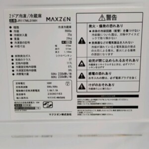 今回は新宿区にお住まいの30代男性・会社員(単身・賃貸マンション)のお客様より、MAXZEN 2ドア冷凍冷蔵庫 JR117ML01WH(2023年製)を出張買取にてご依頼いただきました。