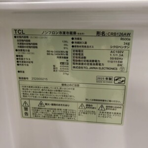 東京都大田区へ出張買取 TCL CRB126AW 冷凍冷蔵庫 高年式美品のため適正価格で査定しました