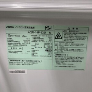 今回は東京都目黒区にお住まいの40代男性・会社員より、AQUA ノンフロン冷凍冷蔵庫 AQR-14P(DS)(2024年製)を出張買取にてご依頼いただきました。単身の賃貸マンションで使用されていたコンパクトタイプの冷蔵庫です。