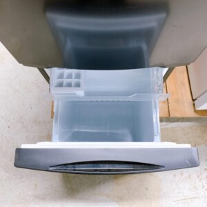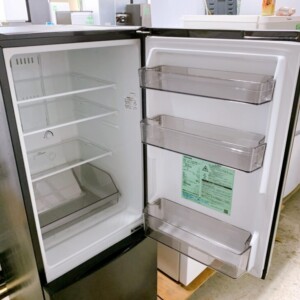 外観は目立つ傷やへこみがほとんど見られない良好な状態で、使用感も少ない印象でした。庫内も清潔に保たれており、棚板・ドアポケット・冷凍ケース・製氷皿などの付属品も揃っていました。冷却機能も問題なく、冷蔵・冷凍ともに正常に動作する状態でした。