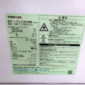 今回は清瀬市にお住まいの40代男性(会社員・単身・賃貸マンション)より、東芝 ノンフロン冷凍冷蔵庫 GR-T15BS(2022年製)を出張買取にてご依頼いただきました。