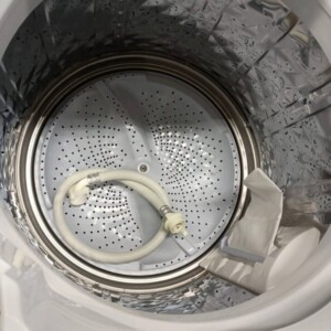 お引き取りした商品は外観に目立つダメージはなく、全体的に良好なコンディションでした。洗濯槽内部はステンレス仕様で、カビや強い汚れは見られず比較的きれいな状態です。付属の給水ホースも確認でき、動作確認では洗浄・脱水ともに問題なく稼働しました。ただし、洗剤投入口に軽微な汚れがあり、日常使用による使用感は見受けられます。