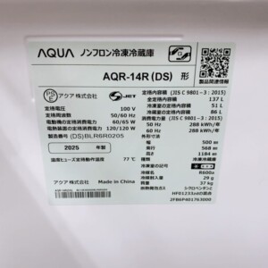 今回は東京都中央区にお住まいの30代男性会社員より、アクア(AQUA)製ノンフロン冷凍冷蔵庫AQR-14R(DS)(2025年製)を出張買取にてご依頼いただきました。