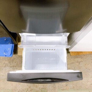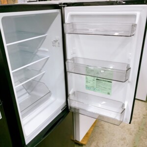 お引き取りした冷蔵庫は、外観に細かな擦り傷や軽微な使用感が見受けられる状態でしたが、目立つ大きなヘコミや破損はありませんでした。庫内は比較的きれいに保たれており、棚やドアポケット、野菜ケースなどの付属パーツも揃っています。動作確認の結果、冷却機能も問題なく、日常使用に支障のないコンディションでした。