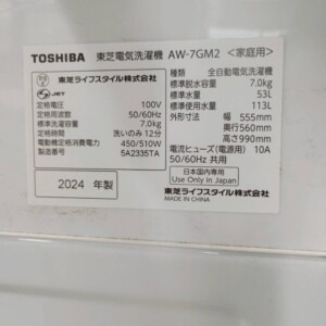 今回は葛飾区にお住まいの30代男性・会社員・単身世帯・賃貸(マンション)のお客様より、TOSHIBA 全自動電気洗濯機 AW-7GM2(2024年製)を出張買取にてご依頼いただきました。