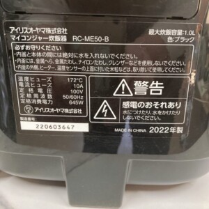 今回は新宿区にお住まいの30代女性・主婦・夫婦世帯・賃貸(マンション)のお客様より、IRIS OHYAMA マイコンジャー炊飯器 RC-ME50-B(2022年製)を出張買取にてご依頼いただきました。
