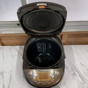 拝見した炊飯器は、外装に擦り傷や細かな汚れが見られる使用感のある状態でした。特にフタ部分には日常使用によるスレやくすみがあり、長年使用されていたことが分かります。内釜についてはコーティングの大きな剥がれは見られず、軽微な使用跡にとどまっていました。また、炊飯・保温・ボタン操作などの動作確認は問題なく良好で、まだ十分に使用できる状態でした。付属品は本体のみでの査定となりました。