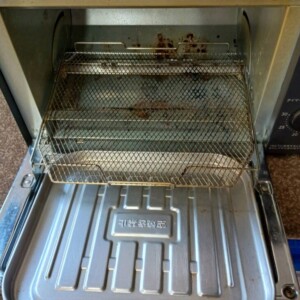 ご依頼いただいたオーブントースターは、外観に細かなホコリや擦れ跡が見受けられる状態でした。庫内については使用に伴う焦げ付きや焼き跡が複数箇所確認され、特にヒーター周辺に汚れの蓄積が見られました。