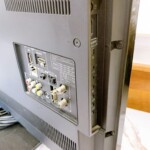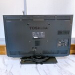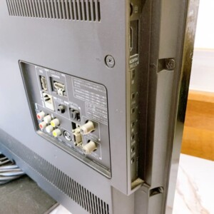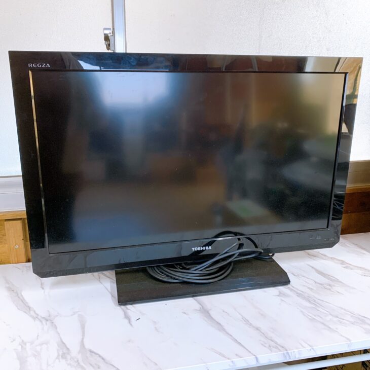 お引き取りしたREGZA 32A2は、電源投入・映像表示ともに問題なく動作する状態でしたが、外装には細かな擦り傷や経年による使用感が見受けられました。スタンド部分にも小傷があり、長年使用されていたことが確認できます。付属品は電源コードのみで、リモコンは欠品している状態でした。