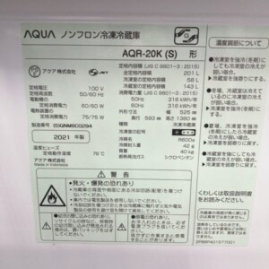 東京都東村山市にてAQUA AQR-20K(S) 冷蔵庫 2021年製 使用感ありのため適正価格で買取いたしました