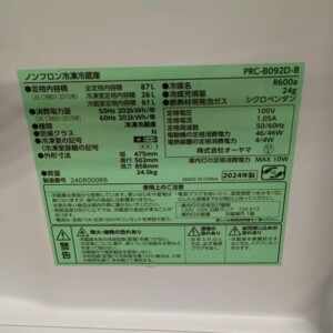東京都国立市にてオーヤマ PRC-B092D-B 冷蔵庫 2024年製 やや使用感ありのため適正価格で買取いたしました