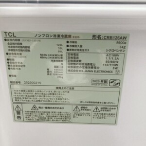 東京都青梅市へ出張買取 TCL 冷蔵庫 CRB126AW(2025年製) 使用感少なめのため高価査定しました