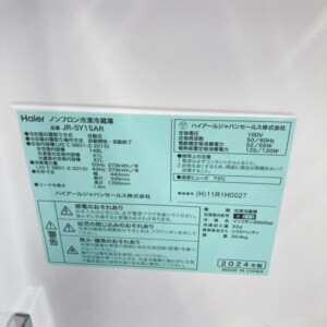 HaierのJR-SY15ARは、148Lクラスのコンパクトモデルで単身世帯を中心に需要が安定しています。さらに2024年製と非常に新しく、庫内外ともに状態が良好である点が大きな評価ポイントとなりました。