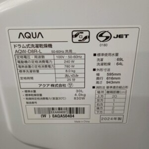 東京都世田谷区用賀にてAQUA AQW-D8R-L ドラム式洗濯乾燥機 やや使用感ありのため適正価格にてお買取いたしました