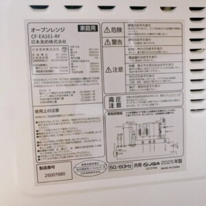 お預かりしたオーブンレンジは、外観に目立つキズや汚れがほとんど見られない非常に良好な状態でした。天面や操作パネルもきれいで、使用頻度が少ないことがうかがえました。庫内も清潔に保たれており、焦げ付きや油汚れはほぼ見られず、電子レンジ・オーブン・グリル機能すべて正常に動作していることを確認しました。全体的に美品といえるコンディションでした。