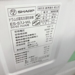 東京都江東区でシャープ ドラム式洗濯乾燥機 ES-S7J-WL 2024年製 使用感ありのため適正価格で買取しました