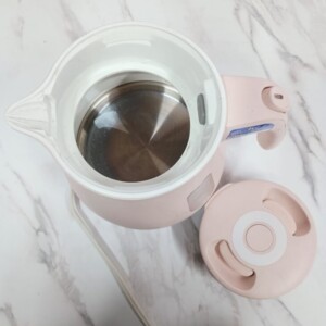 ご依頼いただいた電気ケトルは、外装に軽い擦れや細かな汚れが見受けられ、日常使用による使用感がある状態でした。内部のステンレス部分には水垢の付着が多少確認されましたが、大きなサビや劣化はなく、通電および沸騰動作も問題なく確認できました。フタや給湯レバーも正常に機能しており、基本動作は良好な状態でした。