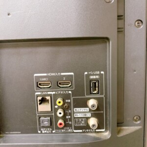 背面端子付近には多少のほこりの付着が見受けられ、長期間の使用を感じる状態ではありましたが、基本的な視聴用途としては問題のないコンディションでした。リモコンも付属しており、操作環境が整っている点は評価ポイントとなりました。