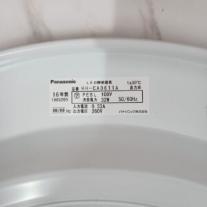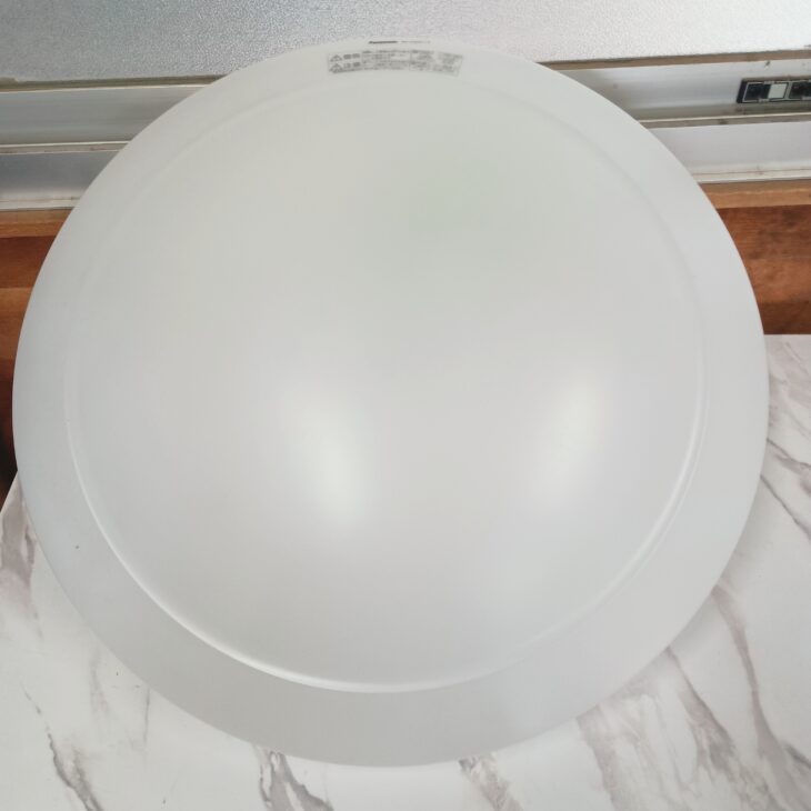お品物はPanasonic製のLEDシーリングライトで、全体的に使用感が見られる状態でした。カバー表面には細かな擦れや軽いくすみがあり、内部にもほこりの付着が確認できましたが、大きな割れや破損はありませんでした。
