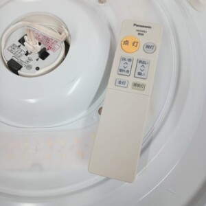 裏面の取り付け部分も確認したところ、機構的な不具合は見られず、通常使用に問題のない状態でした。また、専用リモコンも付属しており、明るさ調整や点灯操作が可能な点も評価ポイントとなりました。