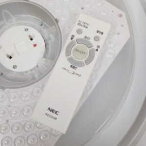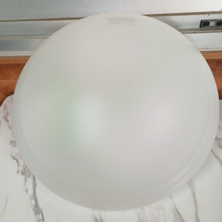 お品物は、カバー表面に細かなスレや軽い汚れが見られる状態でしたが、大きな割れや変形はなく、取り外し後の動作確認でも点灯・調光ともに問題なく使用可能でした。内部のLED基板も劣化は見られず、リモコンも付属しており、通常使用に支障のない状態でした。