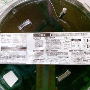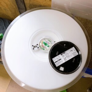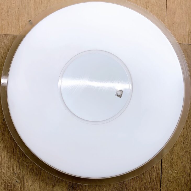 本体はカバー表面に細かなスレやくすみが見られ、長期間使用されていたことがうかがえる状態でした。内部のLED部分は大きな劣化は見られず、点灯確認でも問題なく発光し、調光操作も正常でした。リモコンは付属しており、ボタン操作も反応良好で、実用性に問題のない状態でした。