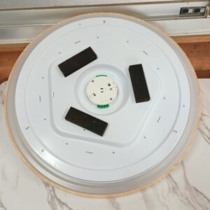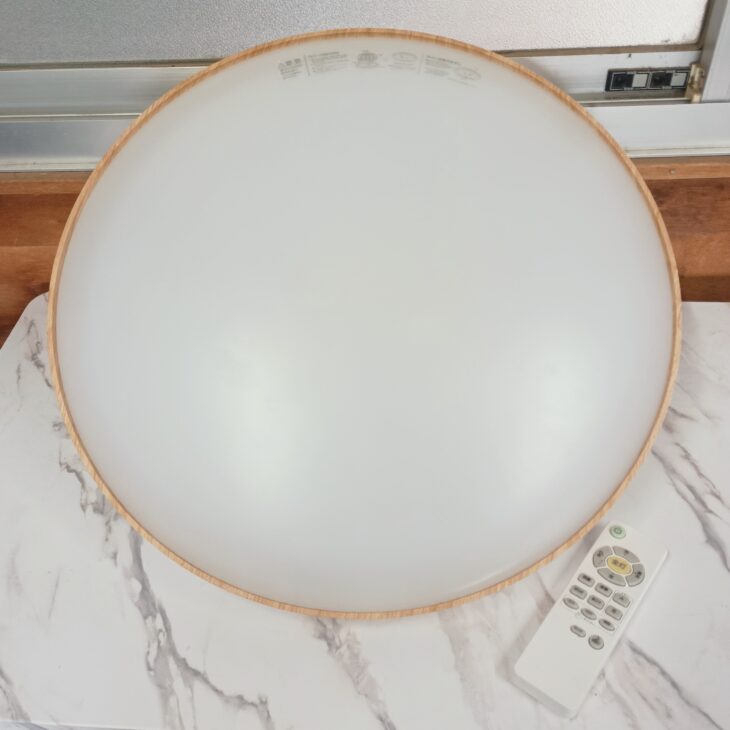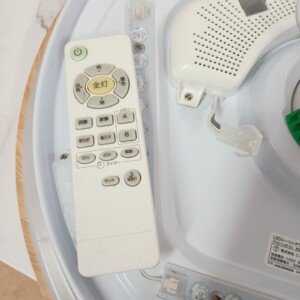 本体カバーは全体的に大きな割れや欠けはなく、日常使用による細かなスレや薄い汚れが見受けられる状態でした。内部のLEDユニットは点灯確認を行い、明るさ・調光ともに問題なく動作しました。リモコンも付属しており、ボタン操作の反応も良好で、通常使用には支障のない状態でした。