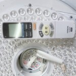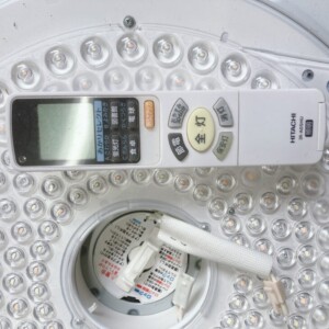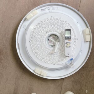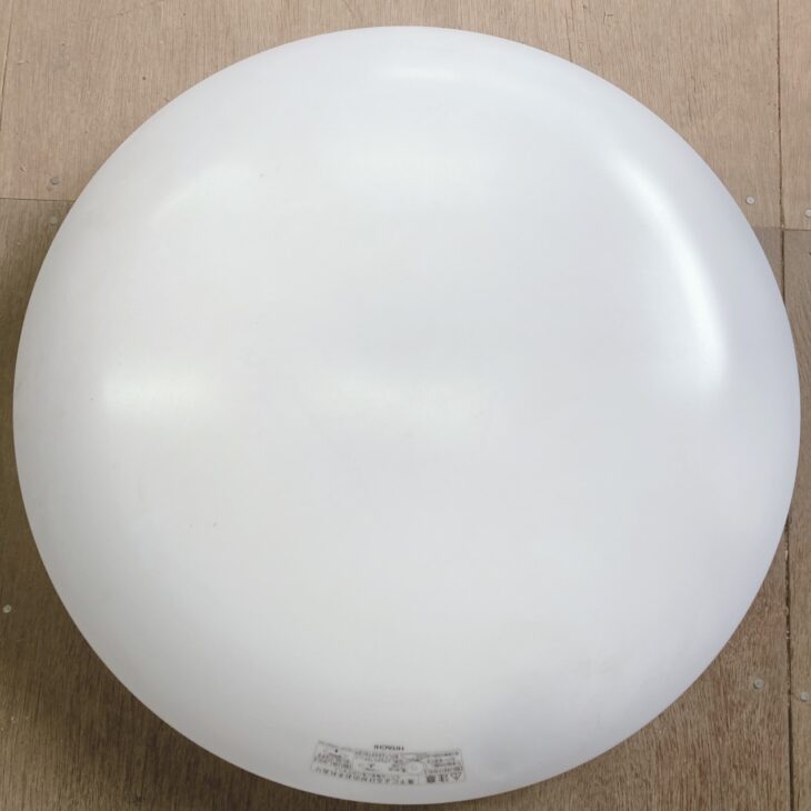 本体カバーには細かな擦れや薄い汚れが見受けられ、長年の使用による使用感がある状態でした。内部のLEDユニットは全体的に均一に発光し、点灯・調光機能ともに問題なく動作していました。リモコンも付属しており、液晶表示・各種操作ボタンの反応も確認済みで、日常使用に支障のない状態でした。