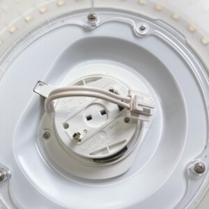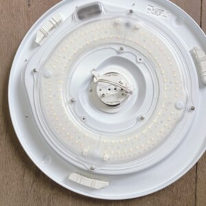 カバー部分には軽度のくすみや薄い汚れが確認でき、長年の使用による経年感が見受けられました。内部のLED基板周辺にも多少のホコリが付着していましたが、点灯・調光ともに問題なく動作しており、まだ十分に使用可能な状態でした。付属品についてはリモコンは欠品していましたが、本体機能は正常でした。
