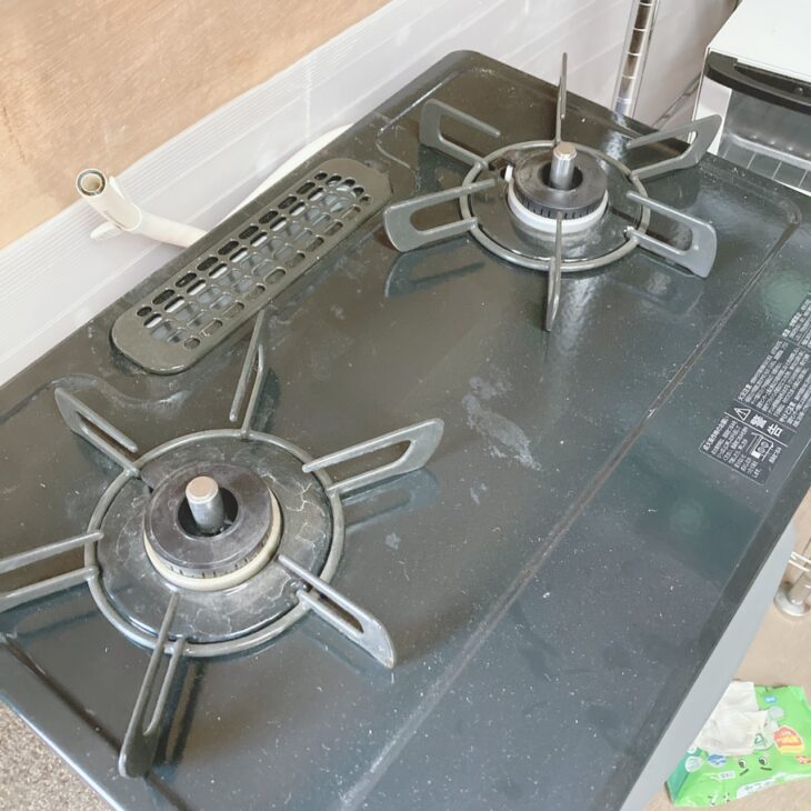 お預かりしたガスコンロは、天板部分に油汚れや白いくもり汚れ、細かな傷が見受けられる状態でした。五徳部分にも使用による焼き跡や変色があり、日常的にしっかり使用されていたことがうかがえます。ただし、バーナー部分の動作や点火機能は問題なく、グリル内部についても大きなダメージはなく通常使用が可能な状態でした。全体としては使用感はあるものの、まだ十分に実用できるコンディションでした。