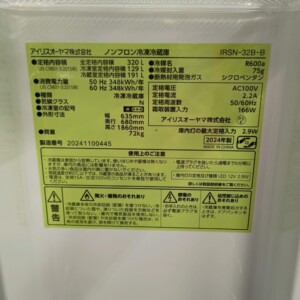 今回は八王子市にお住まいの30代女性(主婦・親子世帯・賃貸マンション)より、アイリスオーヤマ ノンフロン冷凍冷蔵庫 IRSN-32B-B(2024年製)を出張買取にてご依頼いただきました。