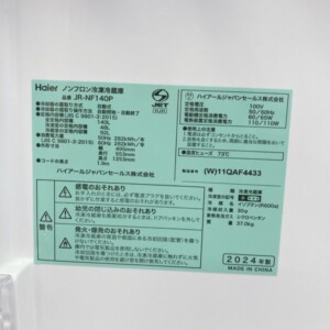 今回は東京都あきる野市にお住まいの20代男性(会社員・単身・賃貸アパート)より、Haier ノンフロン冷凍冷蔵庫 JR-NF140P(2024年製)を出張買取にてご依頼いただきました。
