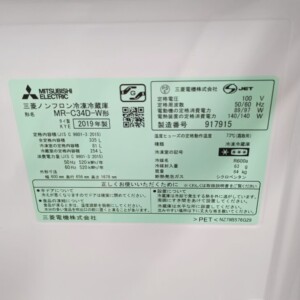 東京都世田谷区等々力で三菱 MR-C34D-W 冷凍冷蔵庫を出張買取 2019年製で状態良好のため適正価格で査定しました