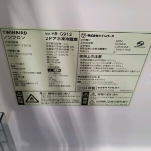 今回は大田区にお住まいの40代男性(会社員・単身・賃貸マンション)のお客様より、ツインバード HR-G912(2024年製)2ドア冷凍冷蔵庫を出張買取にてご依頼いただきました。