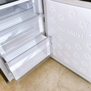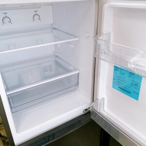 ご依頼いただいた冷蔵庫は、外観に細かな擦り傷や使用に伴うくすみ汚れが見受けられる状態でした。特に下段ドア部分には軽微な汚れがあり、日常使用の痕跡が確認できます。一方で庫内は棚や引き出しに割れや欠損はなく、全体的に整理された状態で、動作確認においても冷却性能に問題はありませんでした。通常使用において支障のないコンディションです。
