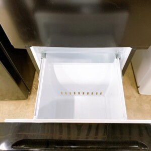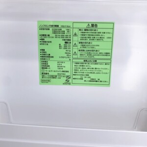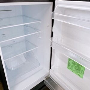 お引き取りした冷蔵庫は、外観に軽微な擦り傷や使用に伴う小さな汚れが見受けられる状態でしたが、大きなへこみや破損はありませんでした。庫内は非常にきれいで、棚板やドアポケットの割れ・欠損もなく清潔に保たれている状態でした。動作確認でも冷却機能に問題はなく、冷蔵・冷凍ともに安定して稼働していました。