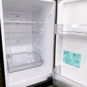 お引き取りした冷蔵庫は2024年製と比較的新しいモデルで、外観にはわずかな擦り傷が見られる程度で大きなダメージはありませんでした。庫内は非常にきれいで、棚板やドアポケット、野菜ケースに割れや欠損はなく清潔な状態が保たれていました。動作確認でも冷却機能は問題なく、冷蔵・冷凍ともにしっかりと稼働していました。
