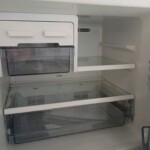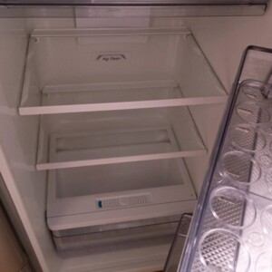 外装には擦れや軽微なキズ、使用に伴う汚れが確認できましたが、大きなへこみなどはなく、全体としては実用的な状態を維持していました。庫内は棚板・ケースともに揃っており、破損は見られません。動作確認では冷却機能も問題なく、冷蔵・冷凍ともに正常に稼働していることを確認しています。